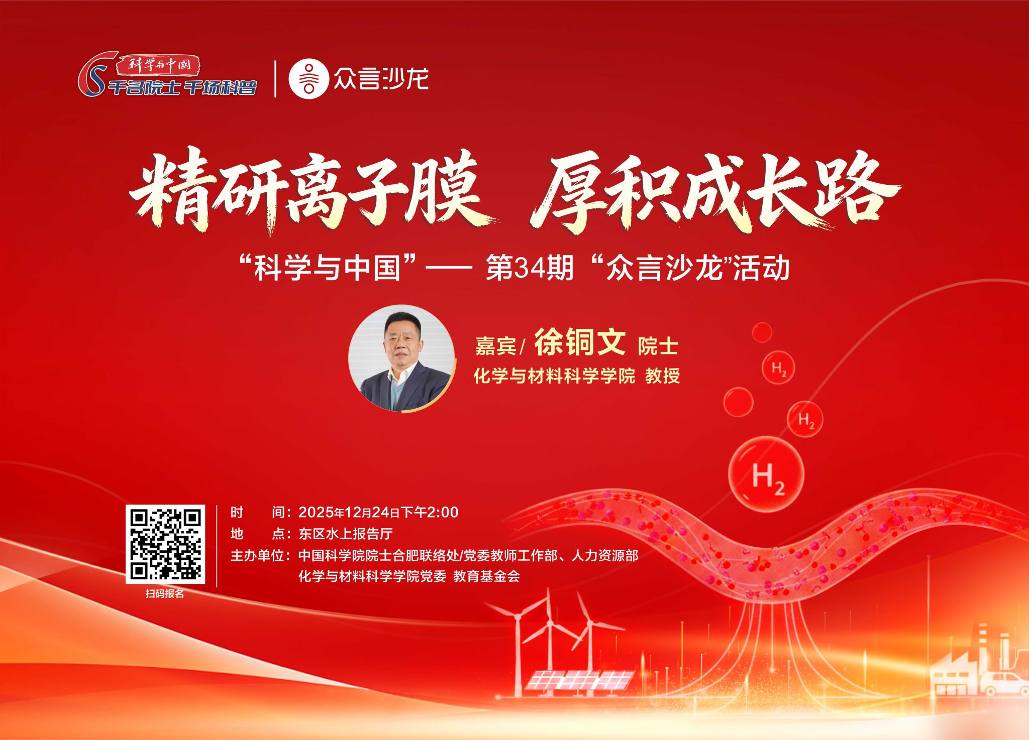 为弘扬科学精神,讲述院士故事,营造热爱科学、崇尚创新的浓厚氛围,“科学与中国”——第34期“众言沙龙”活动将以“精研离子膜 厚积成长路”为主题,邀请中国科学院院士、化学与材料科学学院徐铜文教授作为嘉宾,与校内师生面对面交流。