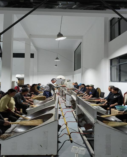 夜间,茶厂内灯火通明,周边来的茶农络绎不绝,学校援建的炒茶机械已开足马力加工芽茶鲜叶,而炒茶师傅们忙着把刚刚上市的瓜片鲜叶手工炒制,不期而至的自媒体新农人借用场地在直播间讲解高山老树茶。