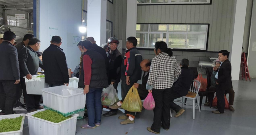 午后,龙马村标准化茶厂内是另一番热闹的景象。茶农们从四面八方赶来,耐心地排着队伍,将上午和下午采摘的鲜叶供给茶厂。茶厂以质论价,优质优价,应收尽收。对茶农来说,采摘的鲜叶及时销售变现,是一份稳稳的幸福。