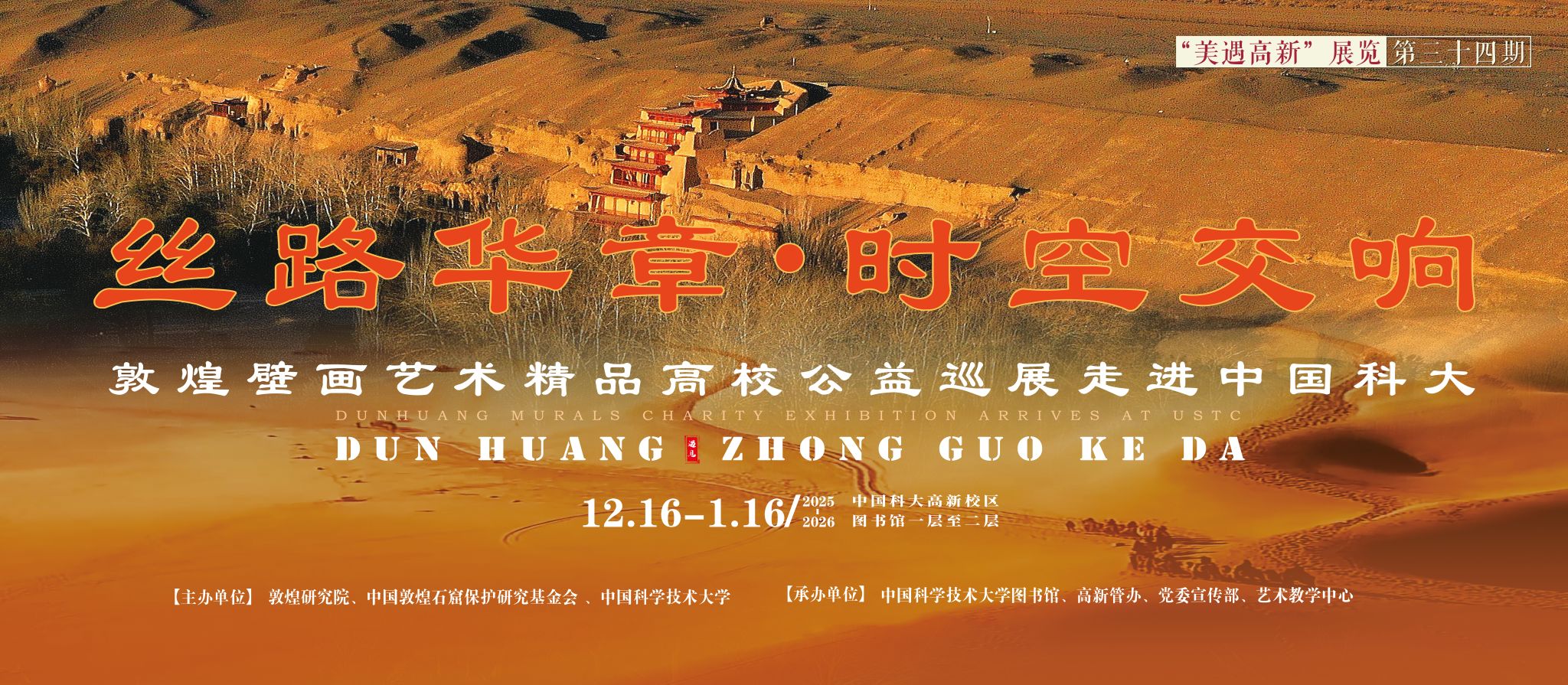 中华优秀传统文化是民族的根与魂,敦煌文化作为丝路文明的璀璨瑰宝,承载着千年历史的厚重底蕴与艺术美学的独特魅力。为传承弘扬中华优秀传统文化,丰富校园文化生活,中国科学技术大学联合敦煌研究院、中国敦煌石窟保护研究基金会,于2025年12月至次年1月举办“丝路华章 时空交响”敦煌壁画艺术精品高校公益巡展。