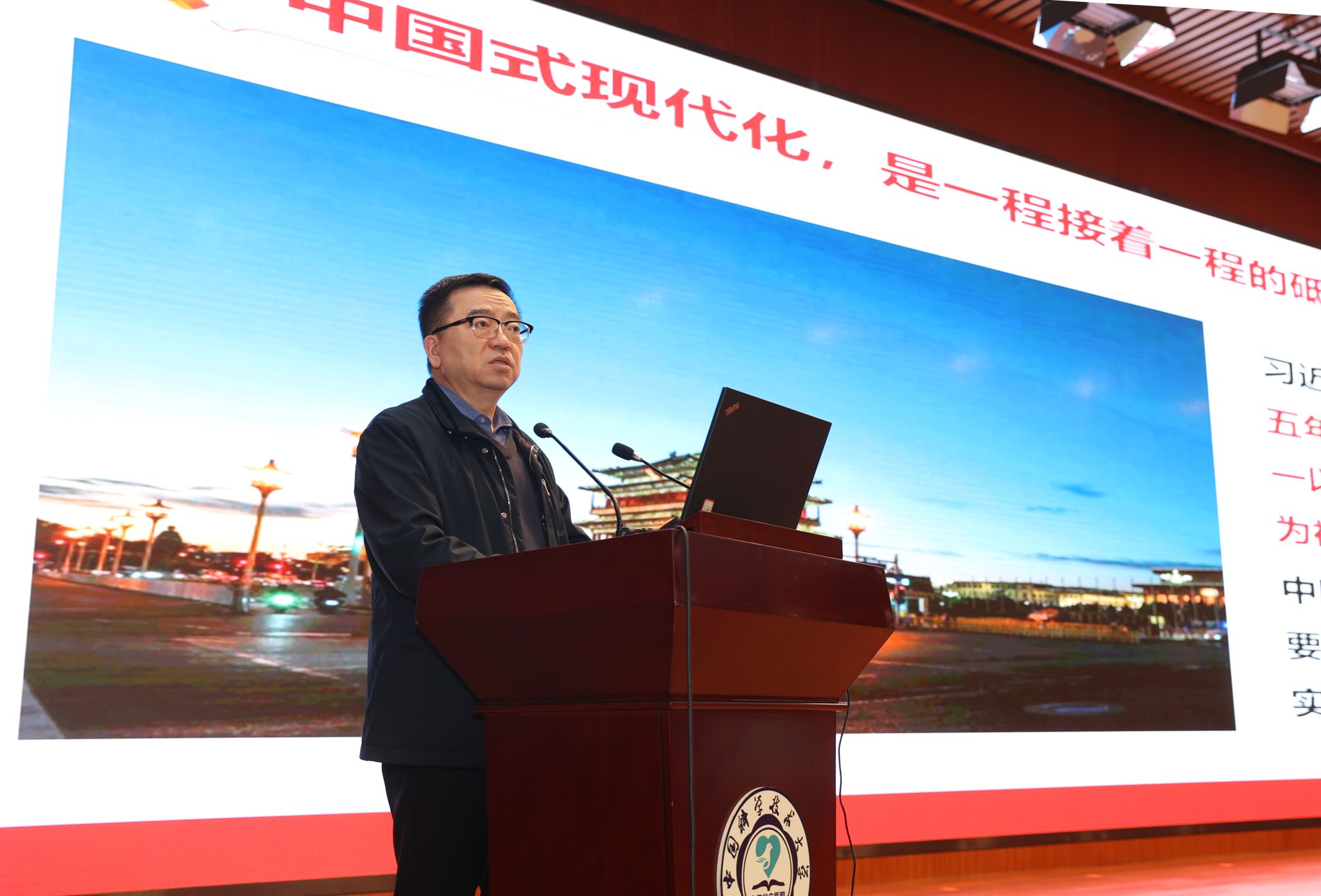 刘连新从全会的基本情况和重要意义、“十五五”时期在基本实现社会主义现代化进程中的重要地位、“十五五”时期经济社会发展的指导方针和主要目标、该时期发展的战略任务和重点举措、坚持和加强党的全面领导这五个维度系统解读了党的二十届四中全会精神及《中共中央关于制定国民经济和社会发展第十五个五年规划的建议》(以下简称《建议》)的核心内涵,报告还回顾了学校和附一院在“十四五”时期取得的斐然成果,详细解读了“十五五”时期国内外形势与任务,明确了未来五年医院高质量发展的目标任务。