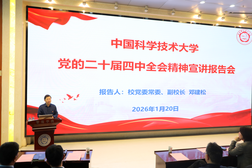 邓建松以《不懈努力、接续奋斗,全面推进强国建设民族复兴伟业》为题,从党的二十届四中全会的基本情况和重大意义,“十五五”时期在基本实现社会主义现代化进程中的重要地位,“十五五”时期经济社会发展的指导方针、主要目标、战略任务和重大举措,坚持和加强党的全面领导等方面系统阐释党的二十届四中全会精神及《中共中央关于制定国民经济和社会发展第十五个五年规划的建议》的核心内涵。报告还结合学校实际,回顾了学校“十四五”时期在学科建设、科技创新、人才队伍和校园基础建设等方面取得的成果,深入剖析了当前学校发展面临的机遇与挑战,明确了未来学校发展的目标任务,重点强调了打造教育科技人才一体发展示范区,加快建设中国特色、科大风格的世界一流大学。