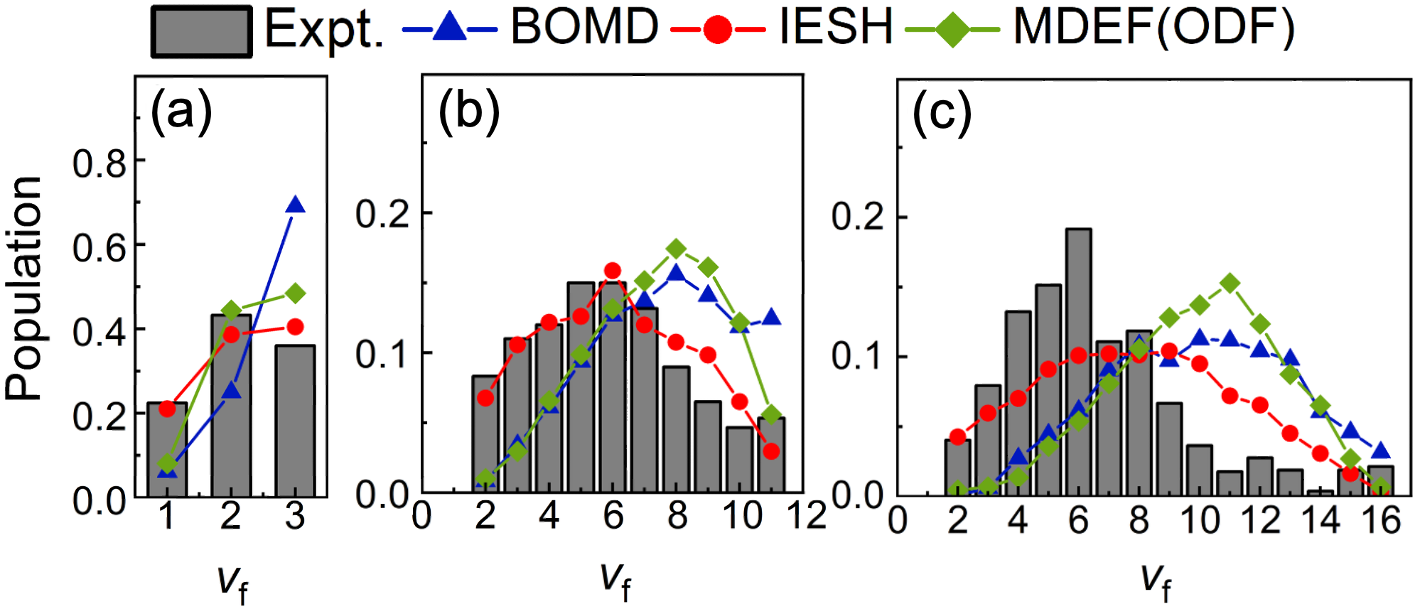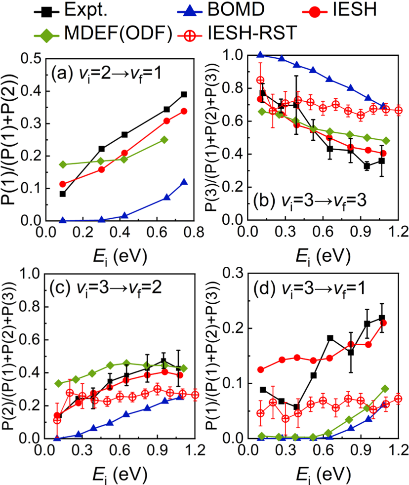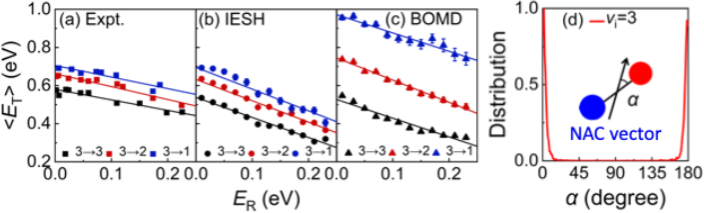模拟结果还显示,在不同的初始振动态下,分子振动弛豫过程对分子取向的依赖性会发生变化,与实验测量吻合(图3)。进一步分析表明,该取向效应源于金属向分子电子转移过程的能垒对分子取向的依赖。