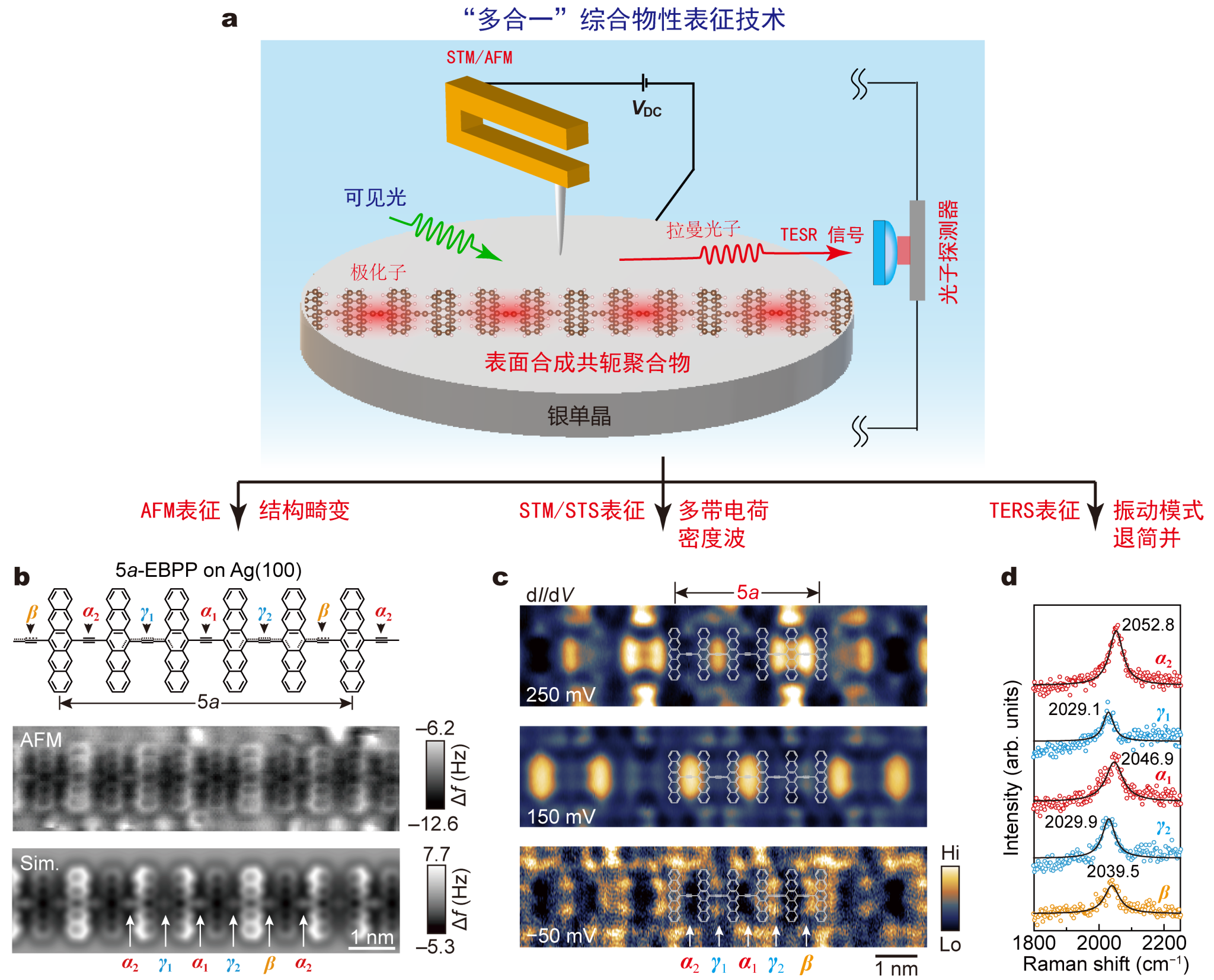 图1 a:基于扫描探针的“多合一”综合物性表征技术。b:AFM表征结构畸变。c:STM/STS表征多带电荷密度波特性。d:TERS表征振动模式退简并。