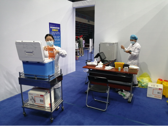 护理部的查青霜护士长也是一位老党员,每天她一来到接种点,就会穿上工作服,一刻不停的忙碌起来,有时她推着物资分发车到各个接种区发放接种物资,有时她在接种区给师生接种疫苗,有时她又推着小车为现场的工作人员发放牛奶补充体力,一天的工作快结束了,查护士长又要拿着冷藏箱到各个接种点统计回收没有用完的疫苗。