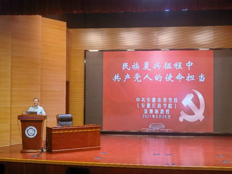 5月26日下午,公共事务学院在东区水上报告厅举办党史学习教育专题辅导报告会,安徽省委党校副校长袁维海教授受邀为全院师生作题为“民族复兴征程中国共产党员的使命担当”辅导报告。校党委常委、总会计师黄素芳,公共事务学院全体师生,软件学院党员师生,财务处全体党员参加报告会。会议由公共事务学院党委书记丁望斌主持。