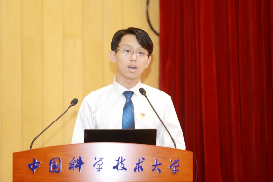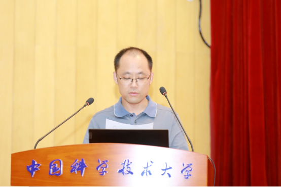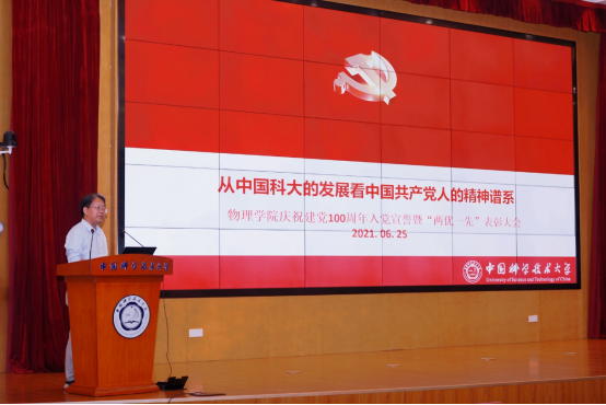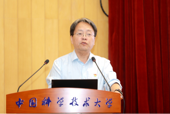随后,陈向军作题为“从中国科大的发展看中国共产党人的精神谱系”的报告。他指出,抗大精神、“两弹一星”精神和老一辈科学家精神等伟大精神共同构成了中国科大精神谱系,并以在中国科大工作过的飞夺泸定桥勇士李友林和“两弹一星”元勋们,以及新一代科学家的“墨子”、“悟空”等重大科技成果为例,阐述了科大六十余年来为党育人、为国育才的初心使命和科教报国的光荣传统。他勉励全体党员坚定理想信念,牢记入党誓词,弘扬老一辈科学家精神,牢记科教报国使命,永葆爱党爱国之心,为建设科技强国、实现高水平科技自立自强做出更大贡献。
