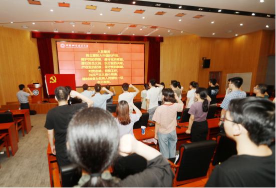 陈向军带领新发展的34名师生党员庄严宣誓:“我志愿加入中国共产党,拥护党的纲领,遵守党的章程,履行党员义务,执行党的决定,严守党的纪律,保守党的秘密,对党忠诚,积极工作,为共产主义奋斗终身,随时准备为党和人民牺牲一切,永不叛党”。