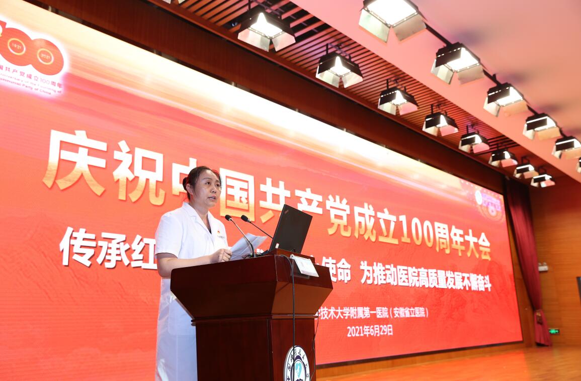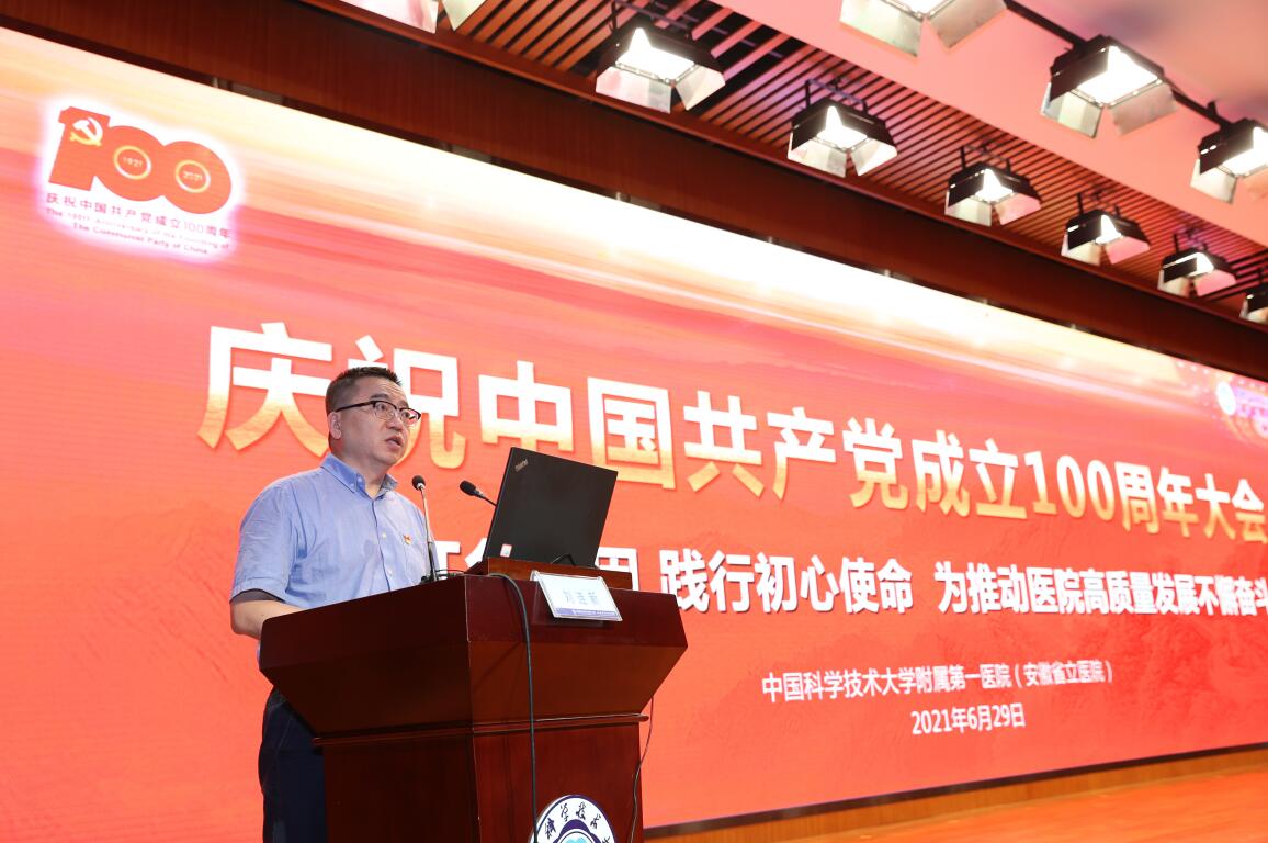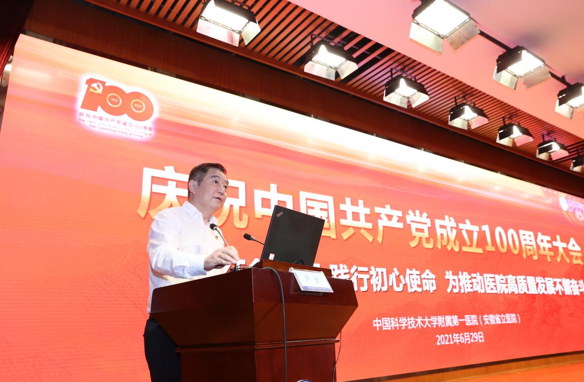 百年永葆初心使命,百年恰是风华正茂。为庆祝中国共产党成立100周年,回顾党的光辉历程,讴歌党的丰功伟绩,激发党员干部和广大职工干事创业的热情和动力,6月29日下午,中国科大附一院在南区会议中心举行“传承红色基因 践行初心使命 为推动医院高质量发展不懈奋斗——庆祝中国共产党成立100周年大会”。