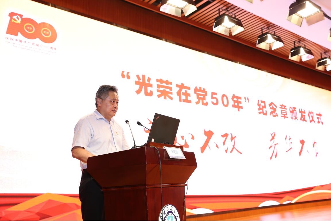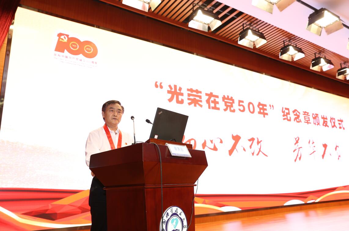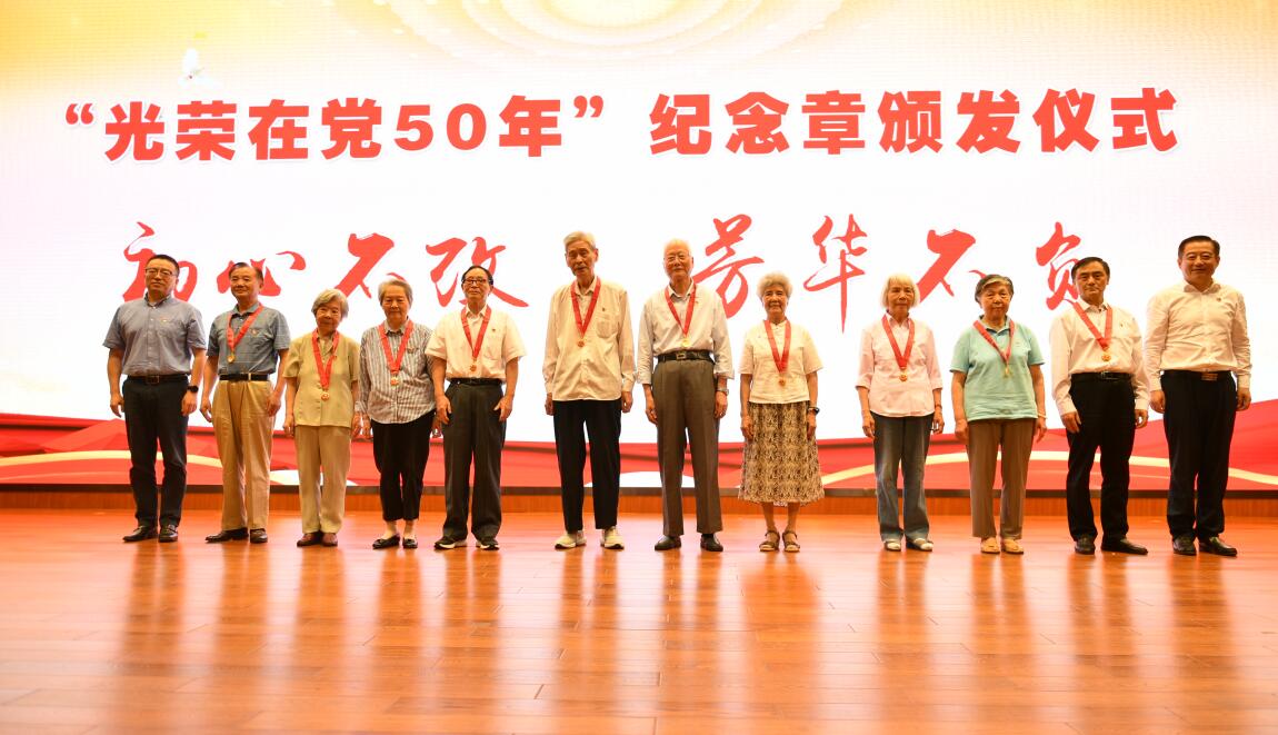 附一院党委副书记、纪委书记黄超群宣读医院“光荣在党50年”老党员名单,院领导刘连新、严光向老党员代表颁授“光荣在党50年”纪念章。广大老党员退休不褪色、离岗不离党,为党的革命事业和卫生健康事业奋斗终身,为新时代党员干部树立了光辉榜样。老党员代表蔡其云深情回顾了入党初心和在党经历,表达了对党永远忠诚的坚定信仰。