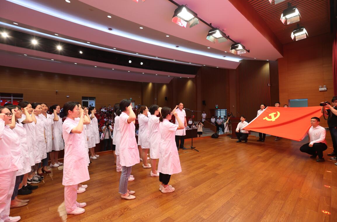 在鲜红神圣的党旗下,51名新党员在附一院党委委员、南区分党委书记鲁朝晖的带领下庄严宣誓。新党员代表、妇产科第一党支部周颖同志分享了自己入党的心路历程。周颖表示,工作多年来始终不忘入党追求,能在建党100周年之际光荣入党,感到无比骄傲与自豪,今后将进一步加强党性修养,牢记入党初心,把个人成长与医院新征程下高质量发展紧密结合,用实际行动为党旗添色、为党徽增辉。