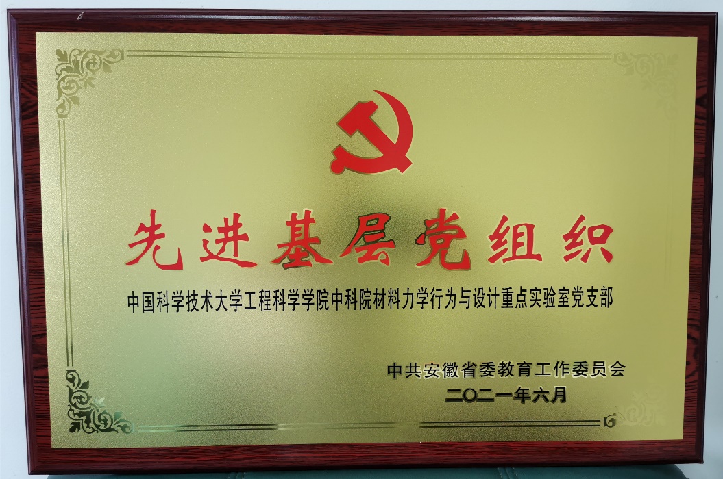 在隆重庆祝中国共产党成立100周年之际,安徽省教育工委共评选出50个安徽省高校先进基层党组织,我校工程科学学院中科院材料力学行为与设计重点实验室党支部荣获“安徽省高校先进基层党组织”称号。