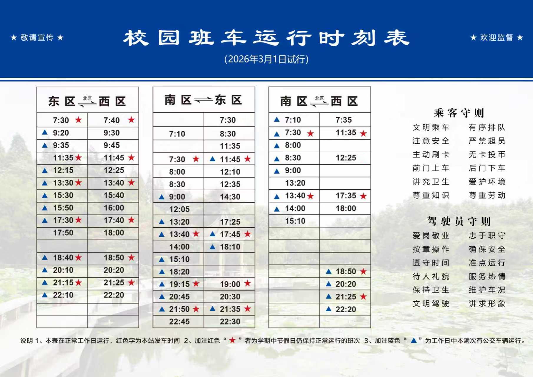 校园班车运行时刻表(2026年3月1日试运行)