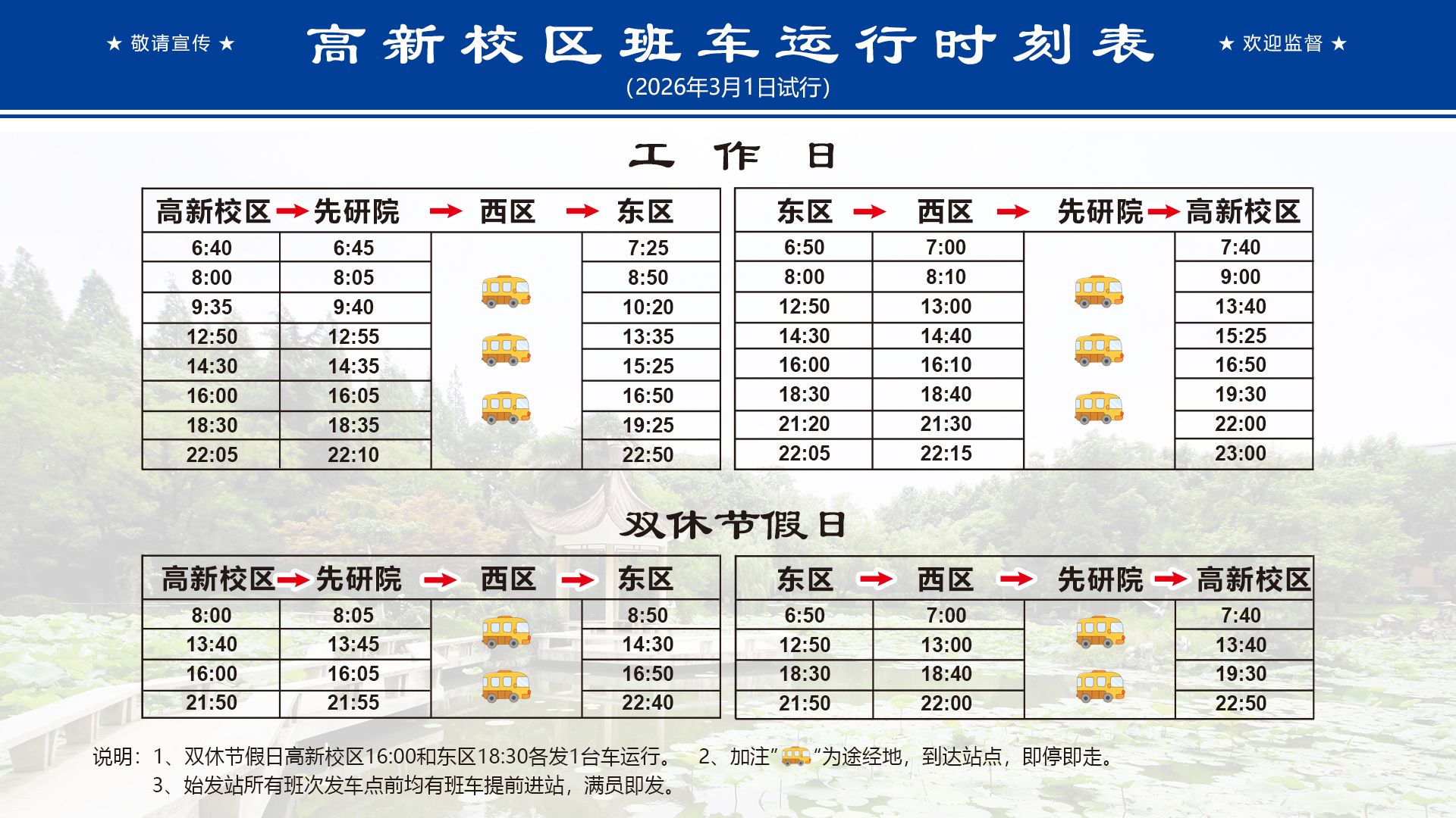 高新校区班车运行时刻表(2026年3月1日试运行)