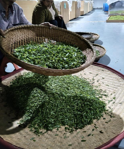 夜间,茶厂内灯火通明,周边来的茶农络绎不绝,学校援建的炒茶机械已开足马力加工芽茶鲜叶,而炒茶师傅们忙着把刚刚上市的瓜片鲜叶手工炒制,不期而至的自媒体新农人借用场地在直播间讲解高山老树茶。