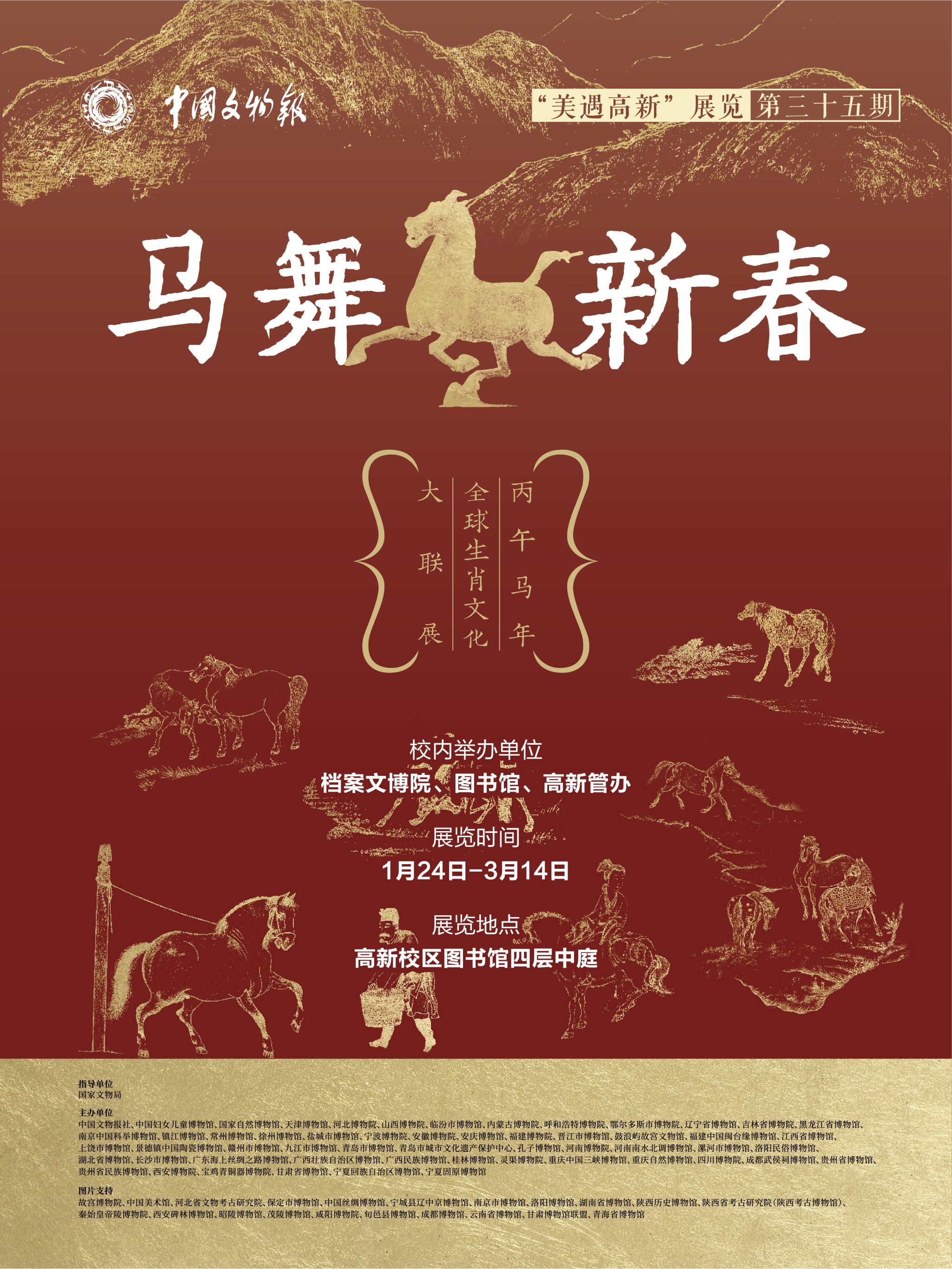 “袖手垂鞭出帝闉,万花栏马舞新春。”马,这一兼具速度与力量的生灵,不仅是人类文明的伴侣,更承载着纵横驰骋、勇往直前的精神图腾。值此丙午马年到来之际,档案文博院携手图书馆和高新园区管办共同举办“马舞新春——丙午马年全球生肖文化大联展”。展览以“人马相伴”为主题,分设“鸿蒙生灵骏”“骁骑贯山河”“百艺载神驹”三大篇章,以图文展板形式集中展示从史前岩画、商周玉马、汉代铜奔马、唐代鎏金舞马,到宋元鞍马绘画、明清瓷器雕塑,乃至近现代徐悲鸿画马等跨越四千年的文物与图像400余件(套),系统勾勒出一幅奔腾不息的中华马文化长卷。