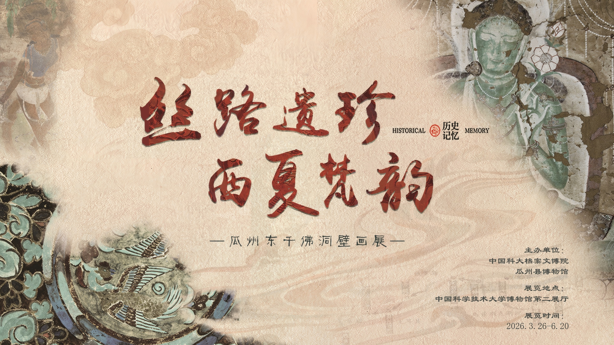 为让全校师生触摸丝路文明的千年脉动,中国科大档案文博院携手瓜州县博物馆推出《丝路遗珍 西夏梵韵——瓜州东千佛洞壁画展》。展览甄选23幅西夏壁画珍品,让大漠石窟中的艺术瑰宝走进校园,引领观者沉浸于一场融信仰、美学与历史于一体的丝路精神之旅。