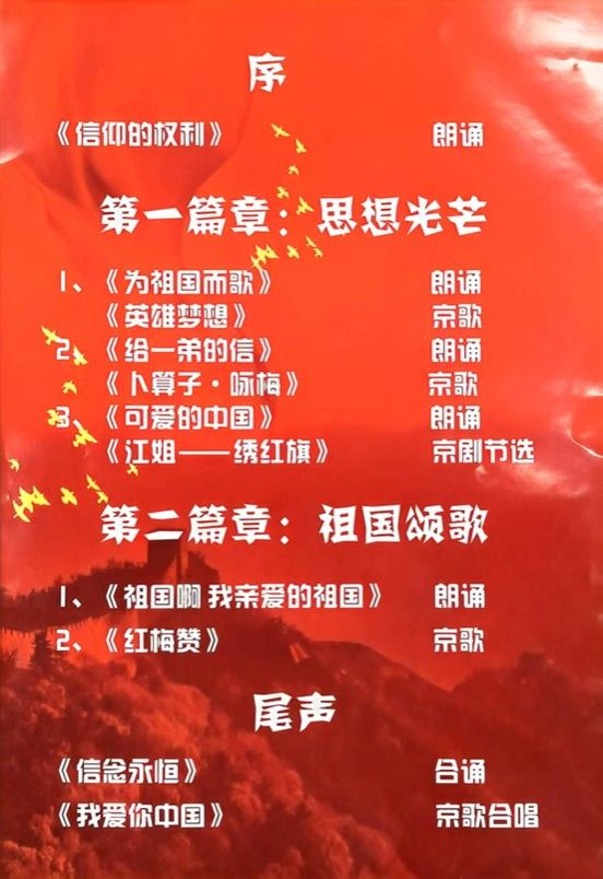 本次朗诵戏曲汇——“诵戏给你”,用烈士的作品和歌颂党、祖国及烈士的名篇,来讴歌伟大的党长期以来的艰苦奋斗历程。演出由“思想光芒”“祖国颂歌”两个篇章构成。第一篇章以三位革命烈士的诗作和他们给亲友的信件以及歌颂烈士的京歌、京剧,来展示先烈们对祖国的热爱和为追求真理视死如归的高尚信念;第二篇章选用极具知名度的歌颂祖国的名篇和京歌来颂扬我们伟大的党领导下的伟大的祖国。