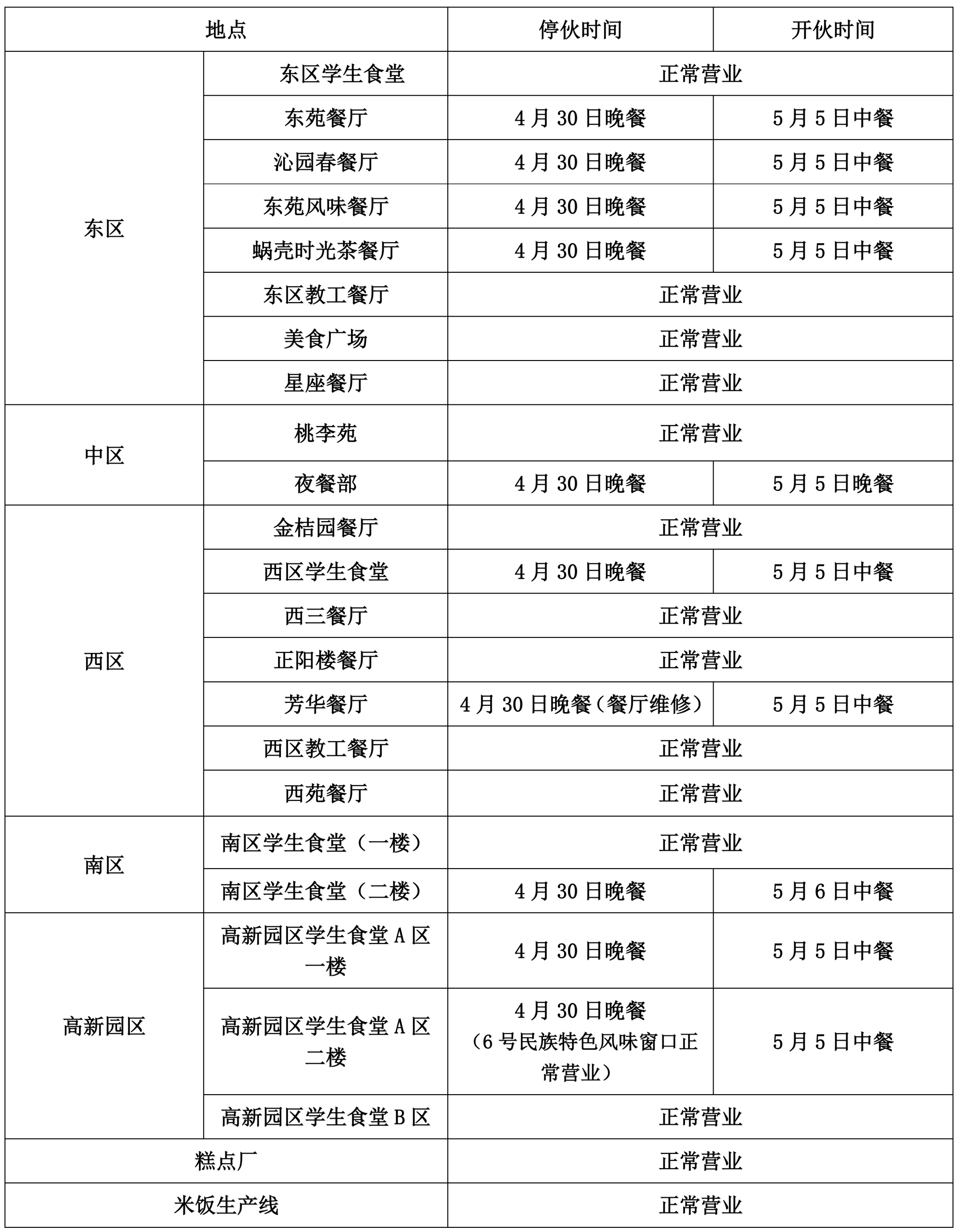 随着五一劳动节假期来临,饮食服务集团结合工作实际,部分食堂将进行轮休,具体营业时间安排如下。祝大家假期生活愉快!