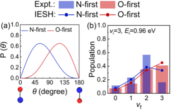 模拟结果还显示,在不同的初始振动态下,分子振动弛豫过程对分子取向的依赖性会发生变化,与实验测量吻合(图3)。进一步分析表明,该取向效应源于金属向分子电子转移过程的能垒对分子取向的依赖。